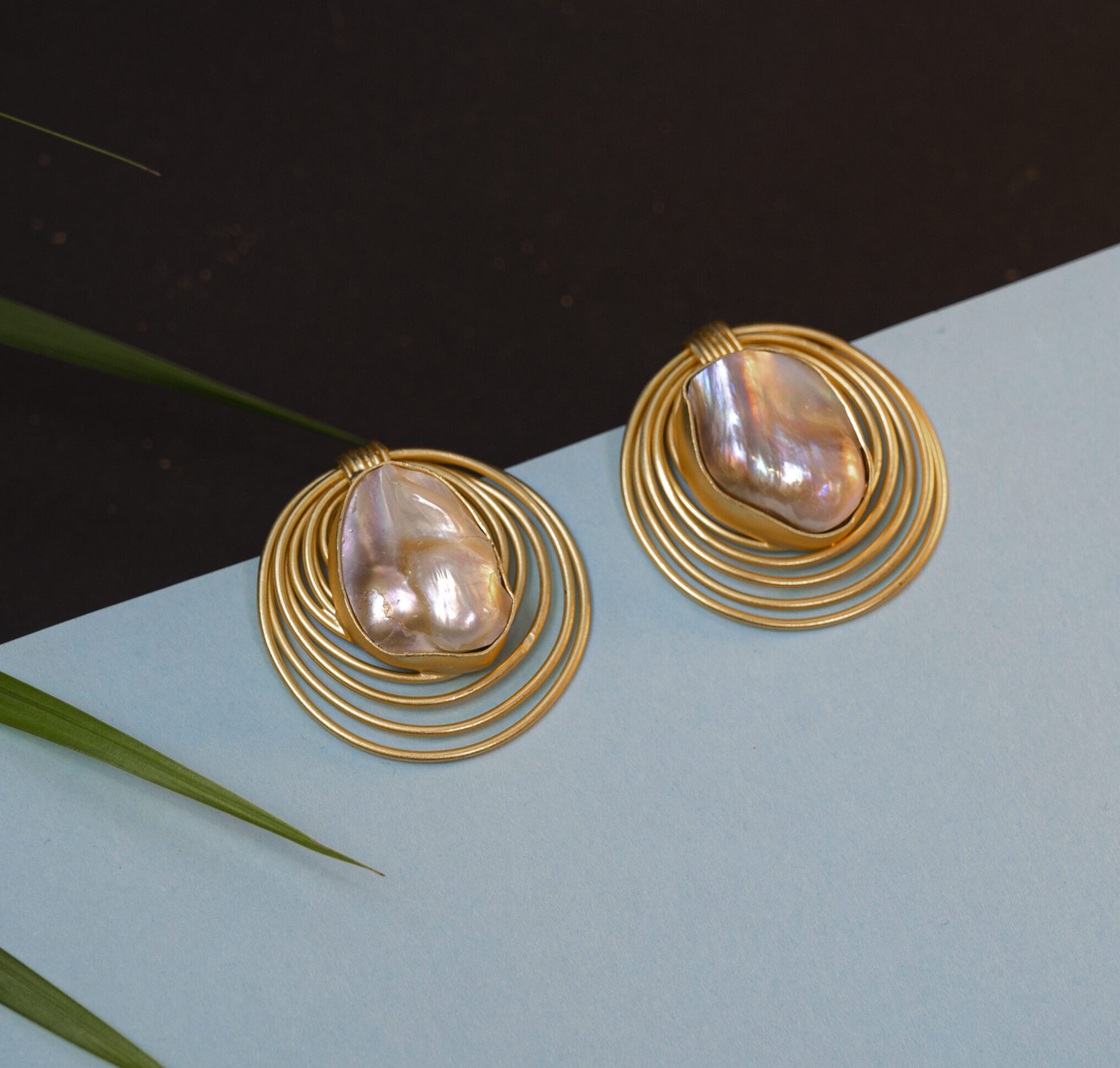 Brass Baroque Pearl Earrings With Matt Gold Finish
