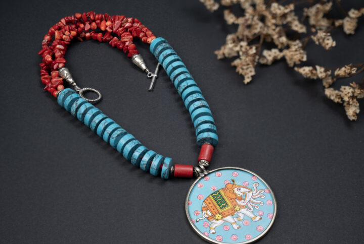 - Handcrafted Neckpiece With Semi-Precious Blue And Yellow Stones, Featuring A Stunning Hand-Painted Peacock Pendant— A Timeless Blend Of Tradition And Elegance.