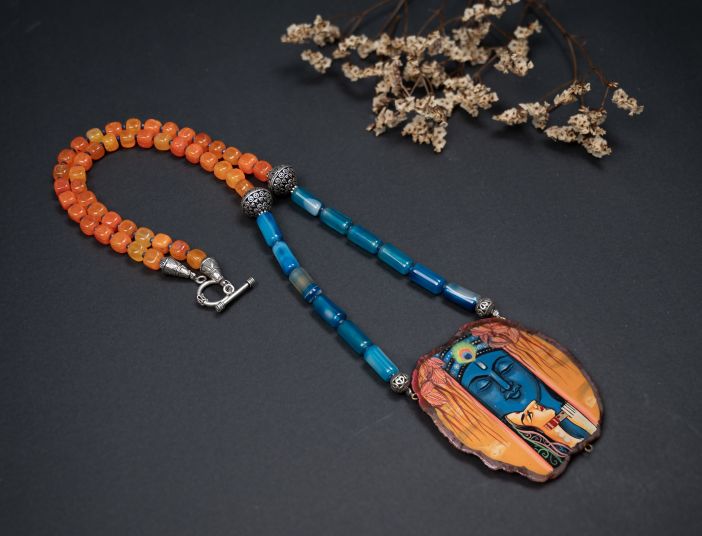 A Handcrafted Neckpiece In Orange Blue Have A Vibrant & Traditional Appeal , The Hand Painted Radha-Krishna Pendant Adds A Divine And Artistic Touch .